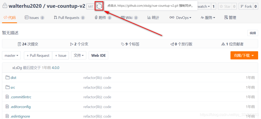 3、等待导入操作完成,然后在导入的仓库中下载浏览对应的该GitHub仓库代码,你也可以点击仓库顶部的“刷新”按钮进行Github代码仓库的同步。