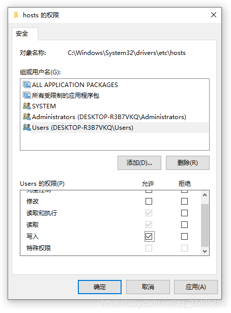 右击->hosts->属性->安全->编辑->点击Users->在Users的权限“写入”后面打勾。如下: